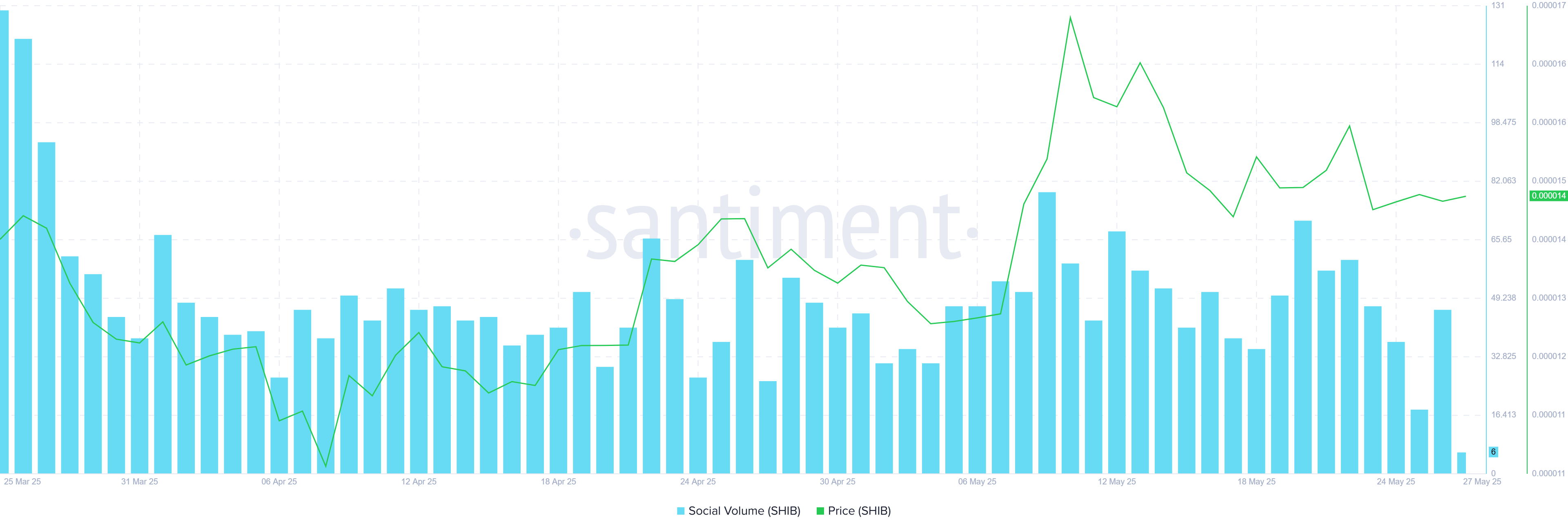 بالإضافة إلى ذلك، ارتفعت المضاربة على SHIB، حيث تظهر بيانات Santiment أن حجم التداول الاجتماعي لهذه العملة قد ارتفع بنسبة 155% خلال 24 ساعة.