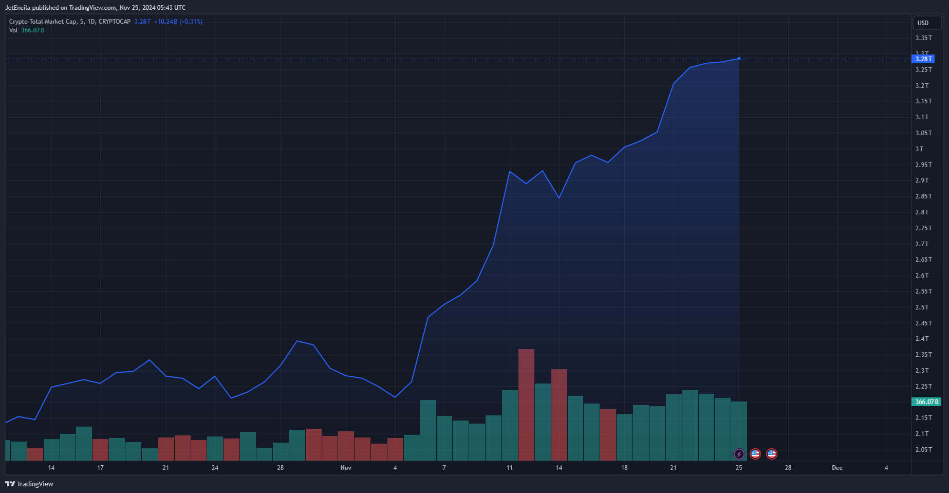 اعتبارًا من اليوم، بلغت القيمة السوقية للعملات المشفرة 3.28 تريليون دولار. الرسم البياني: TradingView