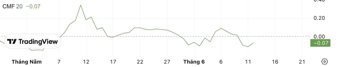 MACD لـ PI | المصدر: TradingViewبجانب مؤشرات MACD، تعكس الديناميكيات الكلية لشبكة Pi أيضًا القدرة على التعافي. لقد انخفض مؤشر CMF مؤخرًا إلى ما دون المستوى 0، مما يدل على أن تدفق الأموال يتراجع من هذه العملة البديلة. المستوى الحالي لـ CMF هو الأدنى منذ بداية شهر مايو، مما يدل على شك المستثمرين. ومع ذلك، إذا تم السيطرة على تدفق الأموال الخارجة وزيادة التدفق الداخلي، فقد تشهد شبكة Pi انعكاسًا إيجابيًا في اتجاه الأسعار.