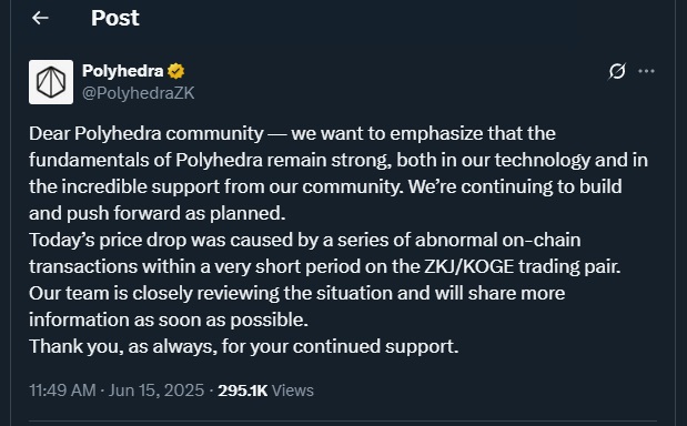 ** Binance ** استجابت بسرعة للحادث ** من خلال الإعلان عن تحديث لقواعد نقاط ألفا الخاصة بها ، ** باستثناء حجم التداول بين رموز Alpha مثل ** ZKJ و KOGE اعتبارا من 17 يونيو 2025 **. يهدف هذا الإجراء إلى منع تركيز المخاطر وتعزيز بيئة أكثر توازنا للمشاركين في السوق. وفي الوقت نفسه ، فإن الإصدار الوشيك لأكثر من 15 مليون رمز ZKJ يزيد أيضا من ضغط البيع قصير الأجل ، ** مما يضيف مزيدا من التعقيد إلى آفاق استرداد الرمز المميز.