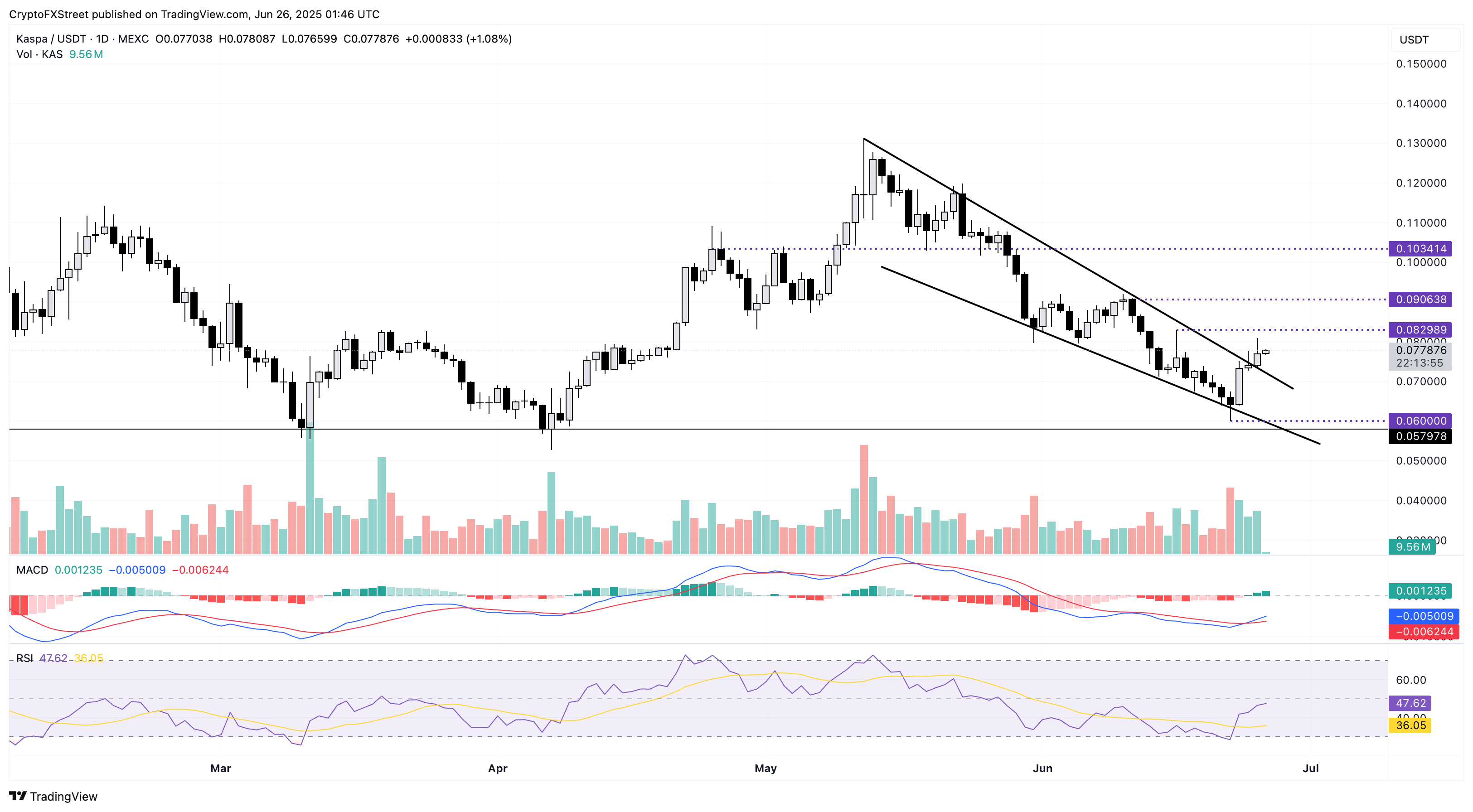 من الجدير بالذكر أن خط الاتجاه الخاص بـ KAS قد اخترق الوتر الهابط الذي تشكّل من خط الدعم المتصل بأسعار الإغلاق في 31 مايو و22 يونيو. الهدف من حركة السعر هو مستوى المقاومة المباشر عند 0.082 دولار، وهو أعلى مستوى في 16 يونيو.