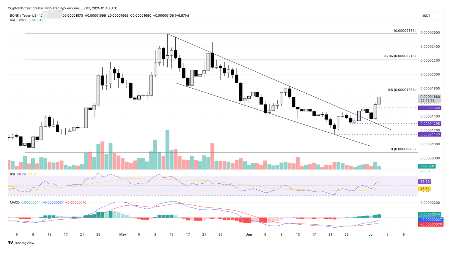 توقعات سعر BONK: استمرار الارتفاع بعد اختراق الوتد، هدف مستويات فيبوناتشي الرئيسية