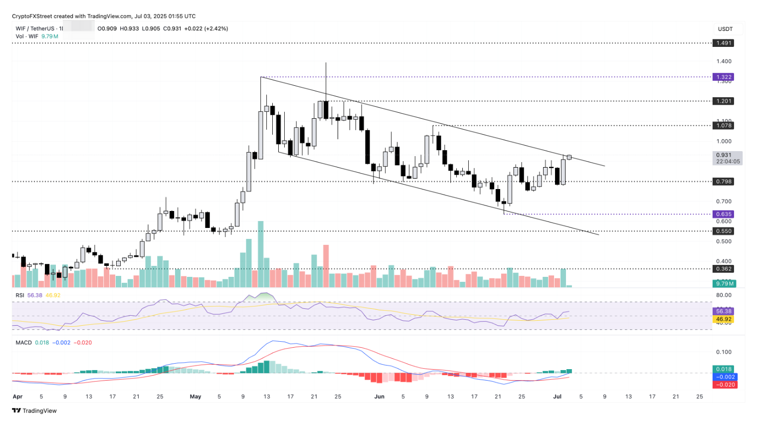 الأداء الحالي: Dogwifhat (WIF) ارتفع بأكثر من 2% أثناء كتابة المقال يوم الخميس، مواصلاً الارتفاع بنسبة 16% في اليوم السابق. WIF يقترب حالياً من خط الاتجاه الهبوطي الرئيسي المتكون من النقاط العالية 12 مايو، 29 مايو و2 يوليو.