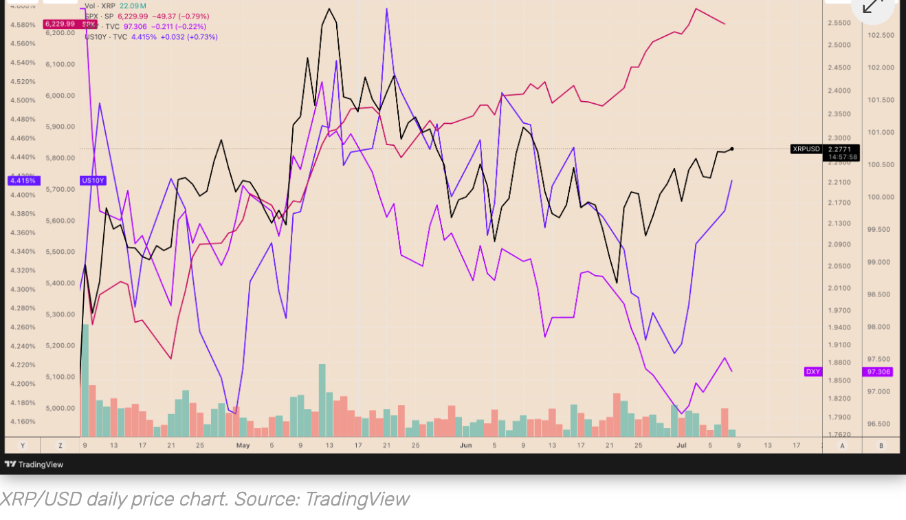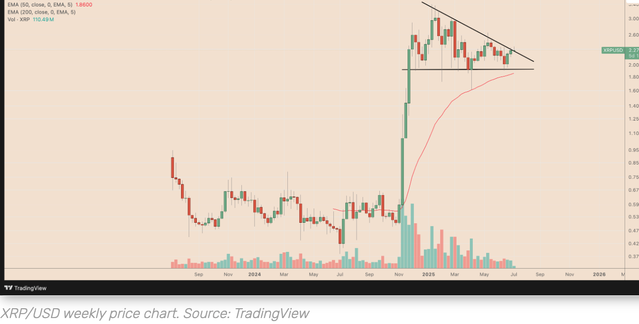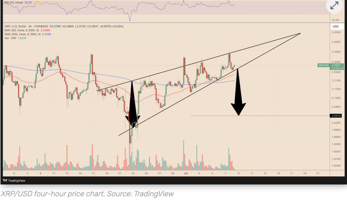 - تتكون هذه الشكل من خط اتجاه متقارب مائل للأعلى، وعندما ينكسر السعر تحت خط الدعم السفلي، فإنه عادة ما يشير إلى انخفاض حاد. اعتبارًا من 8 يوليو، كان سعر تداول XRP حوالي $2.28، وهو أعلى قليلاً من متوسطه المتحرك الأسي لمدة 50 يومًا و200 يوم.