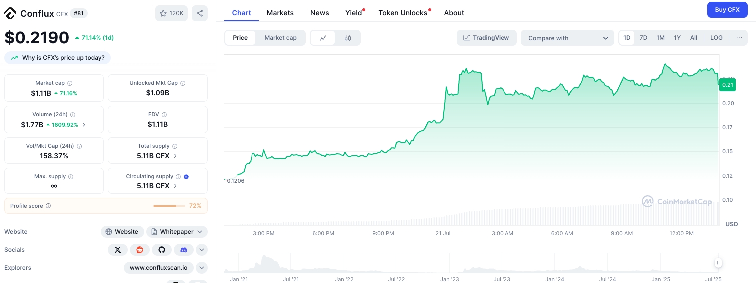 رد فعل السوق كان حماسياً: قفزت عملة CFX بأكثر من 70%