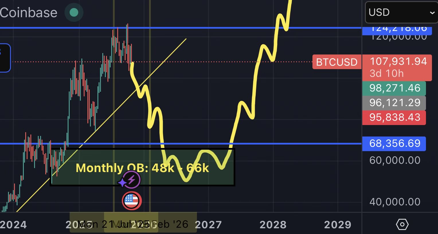 القاعدة الرئيسية: 98,000 دولار (يتداخل مع متوسط 50 أسبوعًا ونقطة منخفضة تاريخية)
