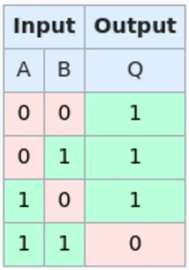 الصورة أدناه عبارة عن بوابة منطقية خاصة جدًا تسمى “بوابة NAND”. يمكنها بناء أي نوع من دوائر البوابة المنطقية. بالطبع، لا يمكن أن تكون فعالة مثل الأنواع المتخصصة الأخرى من البوابات، ولكن لا يزال من الممكن القيام بذلك. . تتكون دائرة البوابة المنطقية لـ BitVM من بوابات NAND.