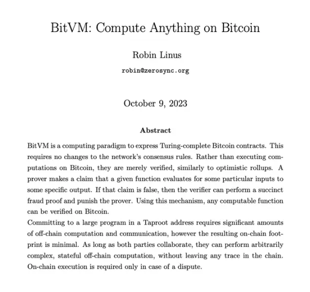 نشر روبن لينوس، المؤسس المشارك لمطور blockchain ZeroSync، ورقة بحثية بعنوان “BitVM: Compute Anything on Bitcoin” في 9 أكتوبر 2023، والتي اقترح فيها إطلاق خطة لجلب العقود الذكية إلى Bitcoin blockchain.