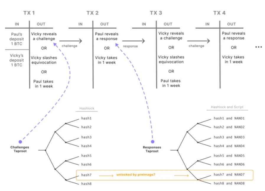 يمكن دحض أي بيان غير متناسق بسرعة بعد بضع جولات من التحقيق. إذا توقف المُمثل عن التعاون مع المنافس خارج السلسلة، فسوف يجبر المُنافس المُثبت على التعاون في السلسلة: في كل مرة يفتح فيها المُنافس قفل التجزئة، فإن عقدة Taproot الورقية المقابلة لكل بوابة NAND في UTXO الخاص بالمُثِّل سيكون لها فقط It لا يمكن إنفاقه إلا إذا كان المُثبِّت يعرف الصورة الأولية التي يحملها المنافس. يمكن للمبرهنة إثبات أن عقدة Taproot Leaf معينة يتم تنفيذها بشكل صحيح من خلال الكشف عن مدخلاتها ومخرجاتها. الفرضية هي أن المنافس يفتح الصورة الأصلية للتجزئة المقابلة لـ Tapleaf من خلال الكشف عنها، ومن خلال البحث الثنائي، يمكن للمنافس قفل خطأ المُثبِّت بعد جولة محدودة (O(logn)) من التحديات والاستجابات.