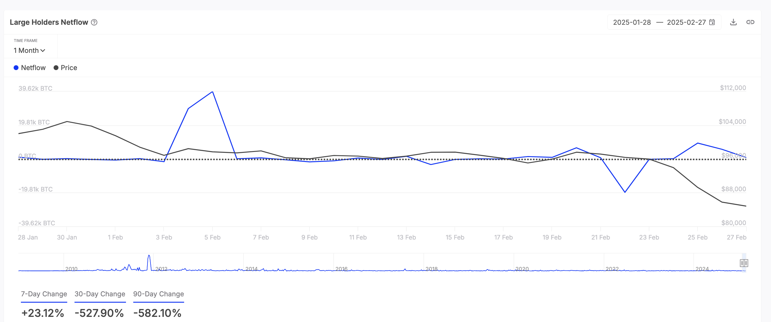 عندما يزيد كبار المالكين من تدفقاتهم ، فإنهم يقومون بتحويل كميات كبيرة من الأصول إلى محافظهم. ينظر إلى هذا بشكل عام على أنه إشارة صعودية ، لأنه يشير إلى الثقة في حركة سعر الأصل المستقبلية وإمكانية حدوث زخم صعودي.