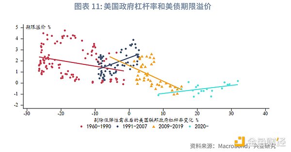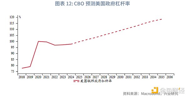 في يناير من هذا العام، أشرنا في “هل يمكن لإنهاء الاحتياطي الفيدرالي لتقليص الميزانية أن يخفض من علاوة المدة؟ – تقرير السندات الأمريكية الشهري 2025، العدد الثاني” إلى أن الاحتياطي الفيدرالي من المرجح أن يتوقف عن تقليص الميزانية في النصف الأول من هذا العام. في أبريل، تم خفض الحد الأقصى للتقليص الشهري للسندات الأمريكية إلى 5 مليارات دولار، وأصبح التأثير الفعلي قريبًا جدًا من التوقف عن تقليص الميزانية. ومع ذلك، بسبب استمرار ارتفاع الدين الأمريكي، لا تزال حصة السندات الأمريكية التي يحتفظ بها الاحتياطي الفيدرالي تنخفض، ومن المرجح أن تظل علاوة المدة في اتجاه صعودي خلال العام. بالإضافة إلى ذلك، بعد عام 2020، ارتفعت مستويات الاهتمام في السوق بالعجز المالي الأمريكي، حيث أن علاوة المدة مرتبطة ارتباطًا إيجابيًا شديدًا بمعدل الرفع المالي للحكومة الأمريكية. حاليًا، تتوقع CBO أن يستمر معدل الرفع المالي للحكومة الأمريكية في الارتفاع، مما يدعم أيضًا زيادة علاوة المدة. بناءً على ما سبق، فإن تباطؤ أو توقف الاحتياطي الفيدرالي عن تقليص الميزانية سيكون له فوائد محدودة على السندات الأمريكية.