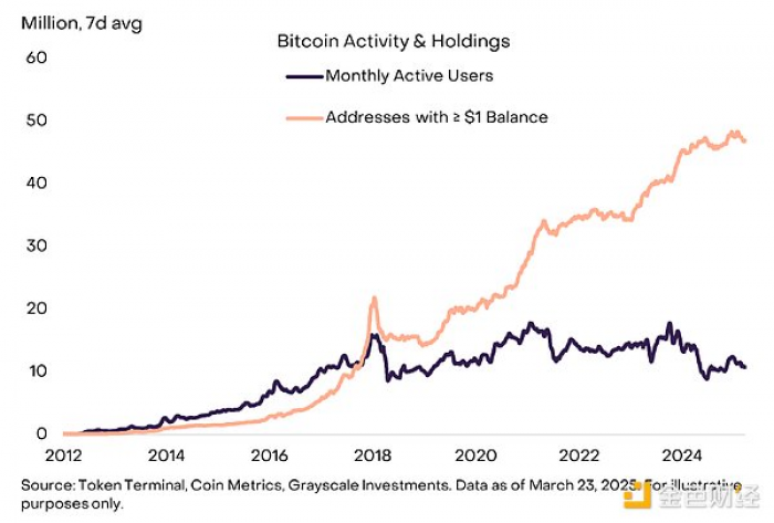 في الربع الأول من عام 2025، كانت مؤشرات نشاط شبكة البيتكوين عمومًا تؤدي بشكل جيد (لملخص مؤشرات الأساس لصناعة العملات المشفرة، يرجى مراجعة الشكل 6 أدناه). على سبيل المثال، بلغ عدد العناوين التي تحتوي على رصيد أكبر من أو يساوي دولارًا واحدًا - وهو مقياس تقريبي لطلب “المستثمرين على المدى الطويل (hodler)” - 48 مليون عنوان، وهو رقم قياسي جديد. بالمقابل، ظل عدد المستخدمين النشطين شهريًا على السلسلة متساويًا تقريبًا مع الربع السابق، حيث بلغ 11 مليون. تشير الفجوة المتزايدة بين هذين المؤشرين إلى أن الطلب الحديث على البيتكوين من المرجح أن يأتي من المستخدمين الذين يرونها كـ “وسيلة لتخزين القيمة” بدلاً من “وسيلة للتبادل” (الشكل 3). في الربع الأول من عام 2025، زادت معدل تجزئة البيتكوين إلى ما يقرب من 800 EH/s في الثانية، مما يعني أن الشبكة المكونة من 5 إلى 6 ملايين جهاز تعدين بيتكوين تحاول كل ثانية تقريبًا حل 800 كوادريليون (10 أس 18) من خوارزمية إثبات العمل.