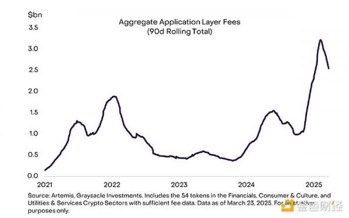 إطار صناعة العملات المشفرة لشركة غرايسكيل (Grayscale) يقسم الأصول المشفرة المرتبطة بالتطبيقات إلى ثلاث فئات: الفئة المالية، وفئة الاستهلاك والثقافة، وفئة المرافق والخدمات. تشمل هذه الأسواق الفرعية جميع مكونات الأنشطة الاقتصادية على السلسلة، بما في ذلك التطبيقات الموجهة للمستخدمين، والبنية التحتية المرتبطة بالتطبيقات (مثل الأوراك والممرات عبر السلاسل) وكذلك البلوكتشين المخصص. وبالتالي، فإن هذه الفئة تتمتع بتنوع عالٍ، ونعتقد أنه من الأفضل تقييم هذه الأصول بالإشارة إلى مجموعات الأصول الفرعية التي تركز على حالات استخدام محددة. ومع ذلك، بالنسبة لمجموعة فرعية من الأصول في فئات صناعة العملات المشفرة الثلاثة لدينا، نقدر أن إجمالي رسومها يصل إلى حوالي 2.6 مليار دولار، مما يعني زيادة بنسبة 99% مقارنة بالربع الأول من عام 2024 (الشكل 5).