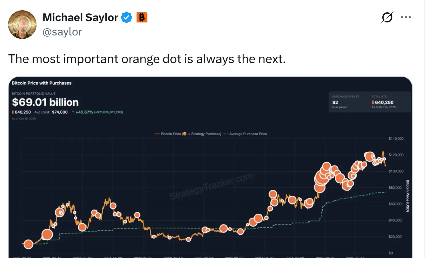 في منشور يوم الأحد على X، شارك سايلور مخططًا من متتبع سايلور لبتكوين، يظهر المشتريات التراكمية لاستراتيجية (BTC). “النقطة البرتقالية الأكثر أهمية هي دائمًا التالية”، كتب أيضًا.