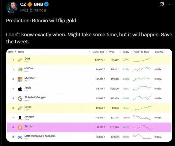 CZ "Bitcoin ستتجاوز قيمتها 30 تريليون دولار من الذهب"... إعادة إحياء الجدل بين البيتكوين والذهب