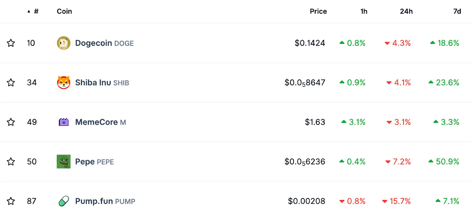 لم تظهر جميع رموز الميم قوة موحدة. سجلت MemeCore (M) مكاسب أسبوعية متواضعة بنسبة 3.3% إلى $1.63 مع تصنيفها في المرتبة 49. حققت Pump.fun زيادة أسبوعية بنسبة 7.1% على الرغم من انخفاضها بنسبة 14.8% خلال 24 ساعة، وتتداول عند $0.002102.