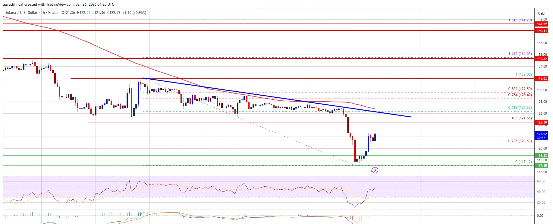 إذا فشل SOL في الارتفاع فوق مقاومة 126 دولار، قد يستمر في الانخفاض. الدعم الأولي على الجانب السفلي بالقرب من منطقة 119 دولار. الدعم الرئيسي الأول بالقرب من مستوى 117 دولار.