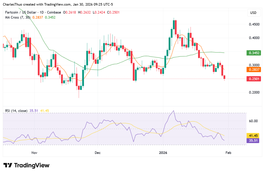 FARTCOIN كان على متن قطار ملاهي مؤخرًا. في الأسبوعين الماضيين، انخفضت العملة المشهورة للميمكوين بنسبة مذهلة بلغت 33.2%.