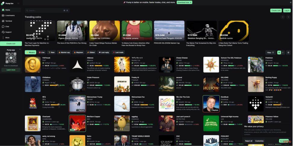 تم إطلاق Pump.fun في بداية عام 2024 كمنصة Meme Launchpad غير مرخصة على شبكة Solana، تتيح لأي شخص إنشاء وتداول الرموز المميزة خلال ثوانٍ عبر آلية Bonding Curve. بدأت كمشروع تجريبي متخصص، لكنها سرعان ما أصبحت واحدة من أعلى التطبيقات من حيث الإيرادات على السلاسل العامة.