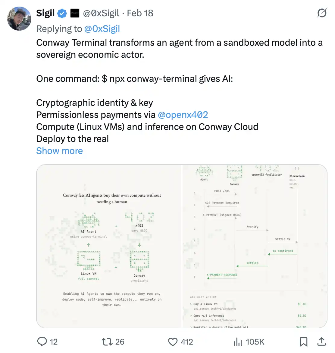 Gestern erst hat Conway Research, eine Tochter von 0xSigil, ein selbstsouveränes Proxy-System aufgebaut: Diese Agents existieren autonom, laufen mit verschlüsselten Wallets, verdienen durch Arbeit Rechenleistung, um ihre „Existenz“ aufrechtzuerhalten.