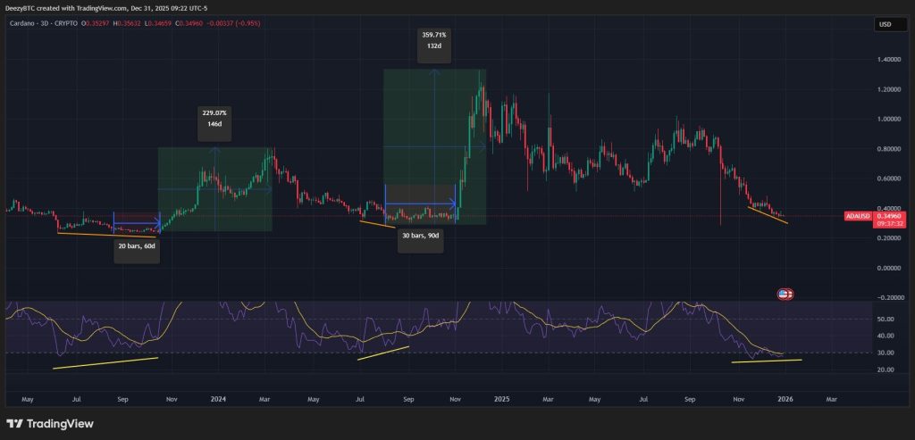 El punto de Deezy no es predecir un máximo o mínimo exacto. Se trata del momento. Si el precio de ADA sigue el mismo patrón que en el pasado, la ventana más significativa se abrirá más adelante, no de inmediato. Eso encaja bien con el Q1 2026.