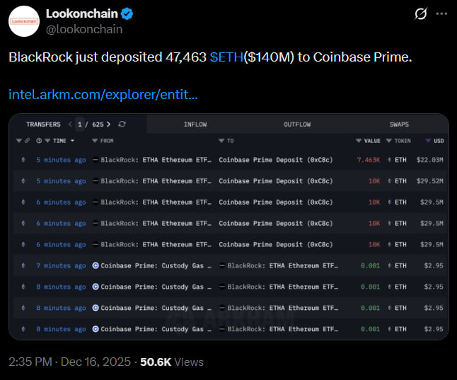 Según Lookonchain, BlackRock ha depositado 47,463 ETH, valorados en aproximadamente $140 millones, en Coinbase Prime.