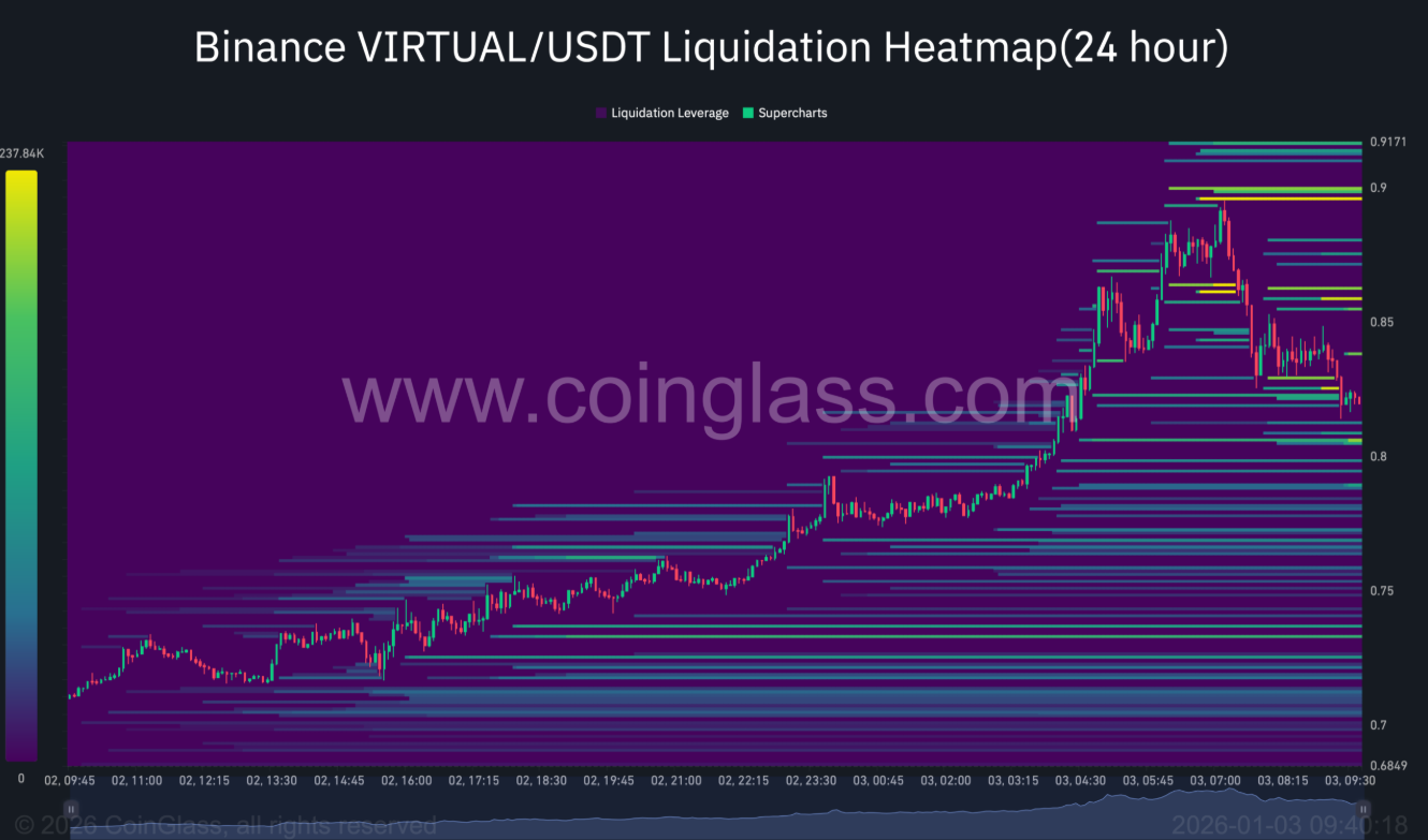 Auparavant, VIRTUAL avait subi une pression de correction avec une baisse de 12 % et était entré dans une tendance baissière. Cependant, en seulement 24 heures, ce jeton a inversé fortement la tendance, se hissant en tête du marché avec une hausse d’environ 21 % au moment de l’observation.