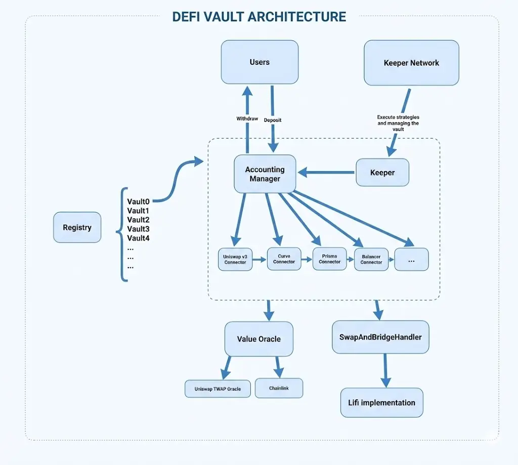 Architecture technique du NOYA Vault (coffre) : chaque coffre est enregistré et géré via un Registry, AccountingManager gère les parts (ERC-20) et la valorisation ; la couche de connecteurs modulaires intègre Aave, Uniswap, etc., en calculant le TVL inter-protocol via Value Oracle (Chainlink + TWAP Uniswap v3). Les échanges et le routage cross-chain sont assurés par Swap Handler (LiFi) ; la stratégie est déclenchée par un Keeper multi-signature, formant une boucle d’exécution auditable et modulaire.