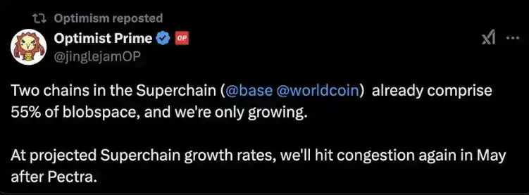 En janvier de cette année, Base co-fondateur Jesse a déclaré dans un tweet que la croissance de L2 a été sérieusement affectée par les limitations de frais de blob, et certaines pressions générées par les besoins quotidiens ont entraîné des augmentations cycliques des frais réseau. Il est important de noter que Jesse souligne depuis la mi-septembre de l’année dernière que la résolution du problème de mise à l’échelle est la priorité actuelle de Base, et que la façon de résoudre le problème ne dépend pas du mécanisme natif du réseau Ethereum.