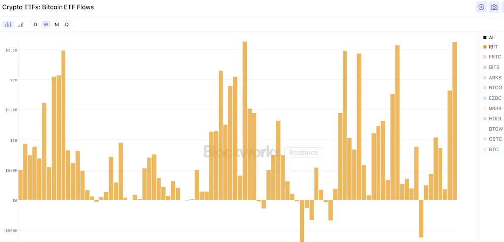 Les ETF bitcoin de BlackRock (IBIT) et ether (ETHA) affichent des totaux d'AUM d'environ $90 milliards et $16 milliards, respectivement. L'IBIT ( avec les flux hebdomadaires montrés ci-dessous ) est l'ETF à la croissance la plus rapide de l'histoire et a récemment franchi le top 20 en AUM.