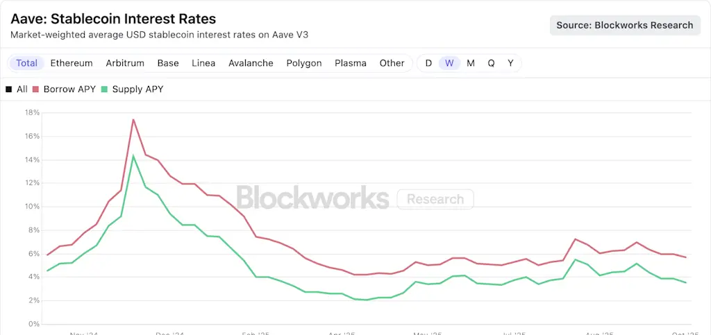 Lorsque les taux directeurs diminuent, les écarts entre le financement en chaîne et le TradFi ont tendance à s'élargir, mettant en place le type de flux de style de base qui a soutenu le prêt lors des cycles d'assouplissement précédents.
