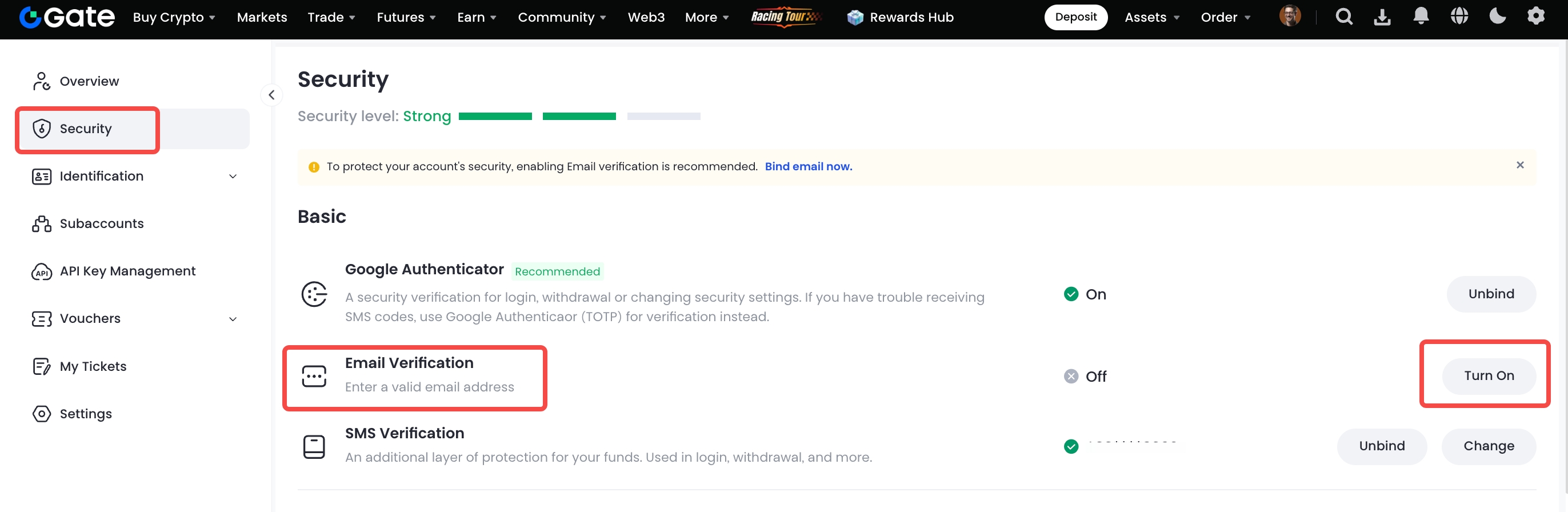 Log in to your account. Place your cursor on the top-right profile icon and go to "Security Settings " - "Email Verification" - "Turn on".
