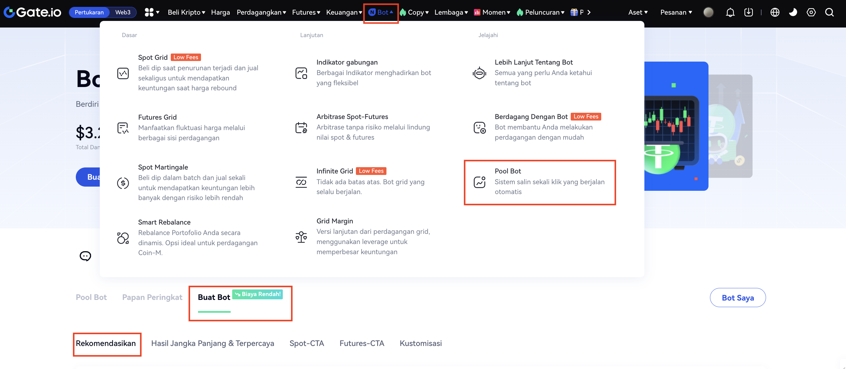 Web: Bilah navigasi – “Bot” – “Pool Bot” – “Buat Bot” – “Direkomendasikan” – “Margin Grid“ – ”Buat Bot“。Kemudian pilih pasangan perdagangan,atur parameter dan klik ”Buat“。Seperti yang ditunjukkan pada gambar di bawah ini: