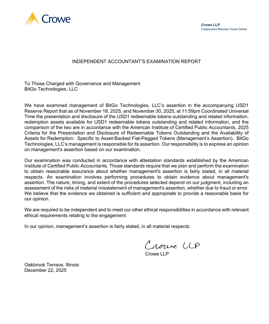 Dalam hal pengelolaan, penyimpanan cadangan USD1 dilakukan oleh BitGo Trust, yang mengelola lebih dari 100 miliar dolar cadangan, memproses transaksi lebih dari 3 triliun dolar, dan melayani lebih dari 1500 klien institusi di lebih dari 50 negara, termasuk menangani 20% dari nilai transaksi Bitcoin on-chain. Pelanggan layanan penyimpanan BitGo Trust termasuk Circle, Paxos, WBTC, Bitstamp, Fidelity Digital Assets, Vanguard, dan lain-lain.