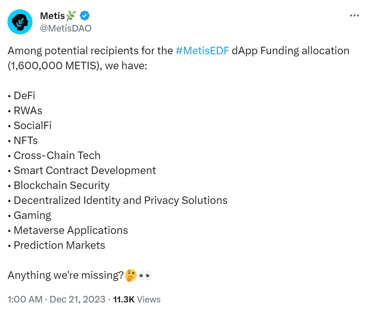 Minggu ini, Metis mengumumkan dana pengembangan ekologi sebesar US$100 juta, dan 4,6 juta METIS dialokasikan untuk mendanai penambangan sequencer, dana penelusuran, penerapan proyek baru, dan proyek lainnya. Future Fund akan fokus pada proyek-proyek di DeFi, ATMR, SocialFi, NFT, teknologi lintas rantai, pengembangan kontrak pintar, keamanan blockchain, solusi identitas dan privasi terdesentralisasi, permainan, dan jalur lainnya untuk mempercepat pertumbuhan ekosistemnya.