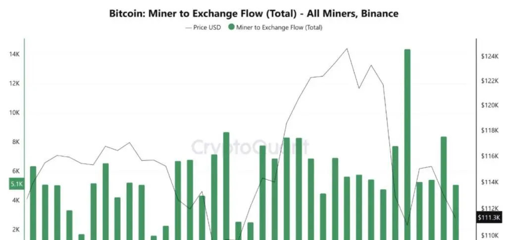 Analisis mengungkapkan bahwa para penambang Bitcoin telah menyetorkan sekitar 51.000 BTC ke bursa sejak 9 Oktober, menunjukkan bahwa mereka kemungkinan besar telah mulai menjual aset mereka. Aliran masuk dari para penambang ini meningkat tajam pada 11 Oktober, mencapai 14.000 BTC - angka tertinggi sejak Juli lalu, ketika harga Bitcoin anjlok menjadi $110.000.