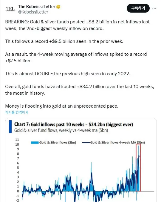 Menurut situs analisis ekonomi The Kobeissi Letter pada tanggal 17 ( waktu setempat ), dana emas dan perak mengalami aliran masuk bersih sebesar $8,2 miliar minggu lalu. Ini adalah aliran masuk mingguan terbesar kedua yang tercatat. Minggu sebelumnya mencatat aliran masuk sebesar $9,5 miliar, menetapkan rekor tertinggi sepanjang masa.