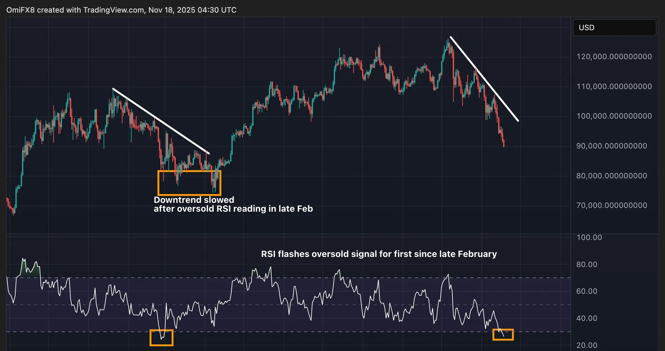 Harga BTC jatuh di bawah $90,000 pada Selasa pagi, turun 28% dari rekor tertinggi lebih dari $126,000 yang dicapai awal bulan lalu. Dengan itu, indeks kekuatan relatif 14-hari (RSI) — ukuran momentum harga yang banyak diikuti — telah turun di bawah 30, menandakan kondisi oversold. Ini berarti penurunan BTC yang sedang berlangsung telah cukup tajam untuk mengundang jeda atau potensi rebound.