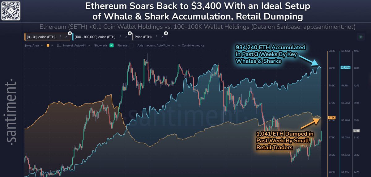 Data on-chain baru menunjukkan bahwa pemegang ETH besar, paus dan hiu, diam-diam telah menyerap ~934.240 ETH selama tiga minggu terakhir, senilai lebih dari $3,15 miliar. Selama periode yang sama, pedagang kecil bergerak ke arah yang berlawanan, membuang 1.041 ETH ke pasar.