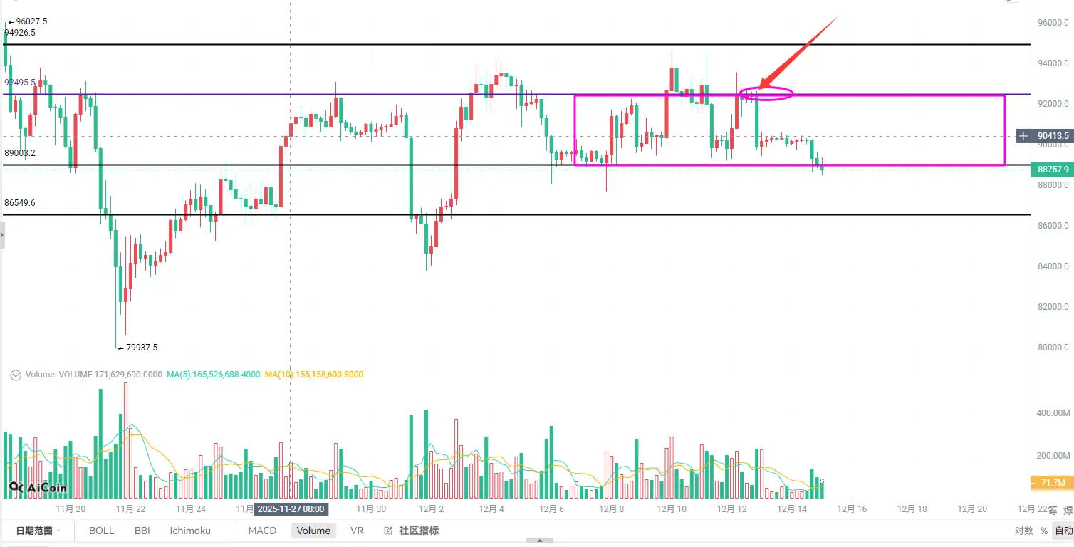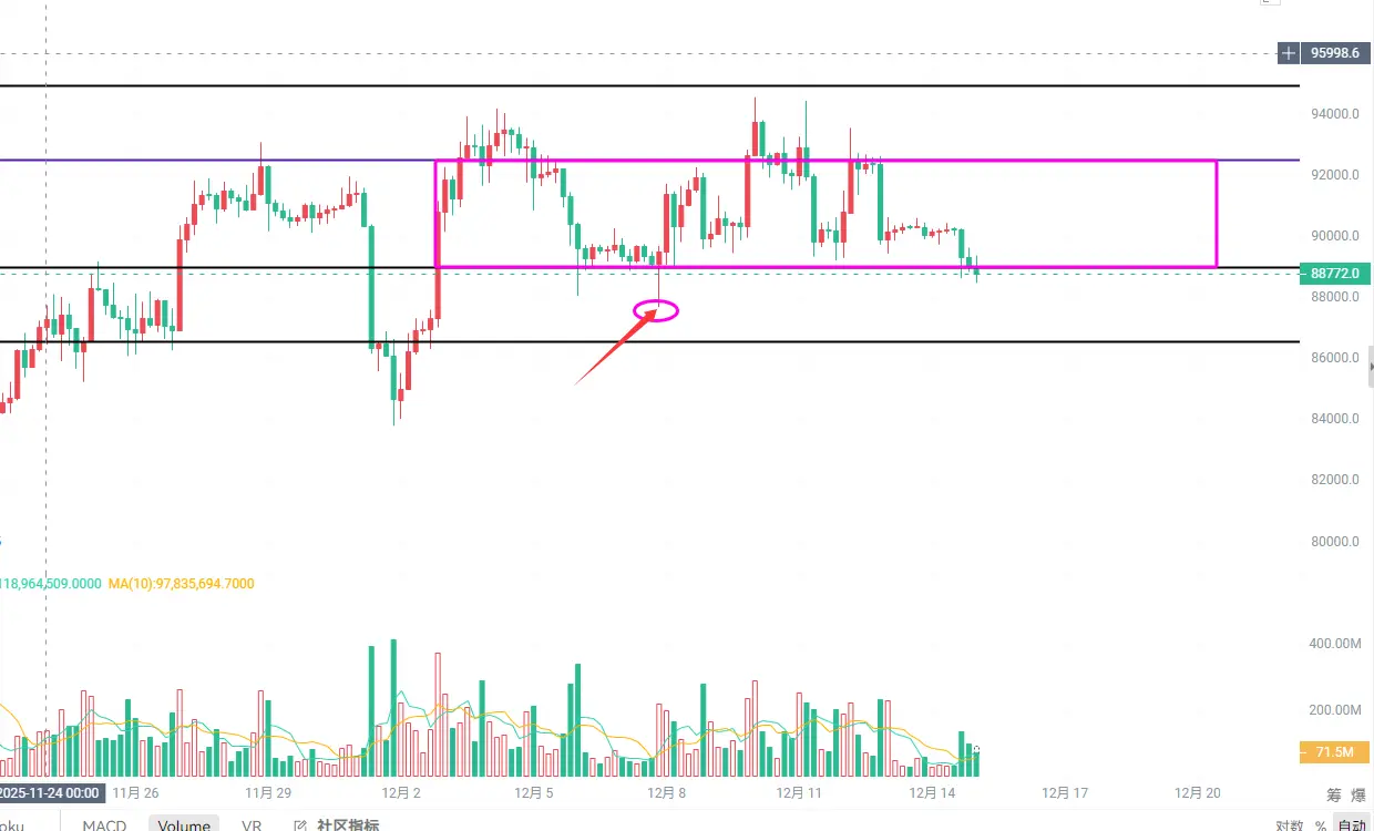 Kemarin malam, lonjakan penurunan tajam itu, berapa banyak orang yang masih meraih keuntungan di sore hari. Malam hari, setelah melihatnya, langsung pecah mentalnya. Bitcoin selama akhir pekan dan Sabtu cenderung berfluktuasi di sekitar 90500-90000, tiba-tiba turun cepat saat malam hari, mencapai sekitar 88500, volume transaksi dan volatilitas harga meningkat secara signifikan. Ritme penurunan ini memberi tahu kita bahwa pasar memasuki fase panic selling, namun struktur harian masih dalam proses memperbaiki arah bullish. Kemarin malam, penurunan itu lebih tampak seperti pengisian ulang likuiditas, bukan akhir dunia.