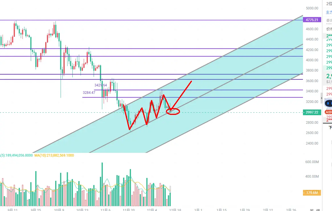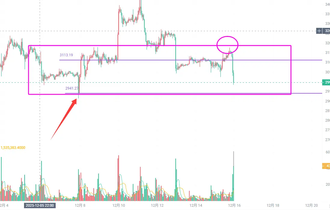 ETH: Altcoin ini saat ini menunjukkan rebound yang sangat kuat, dan ketika turun juga sangat cepat. Malam ini kita hanya perlu memperhatikan apakah support di kisaran 2950-2930 bisa bertahan, jika bertahan maka akan muncul pola V balik di siang hari, jika tidak bertahan maka akan terus menurun ke support kuat di sekitar 2800 di garis leher.