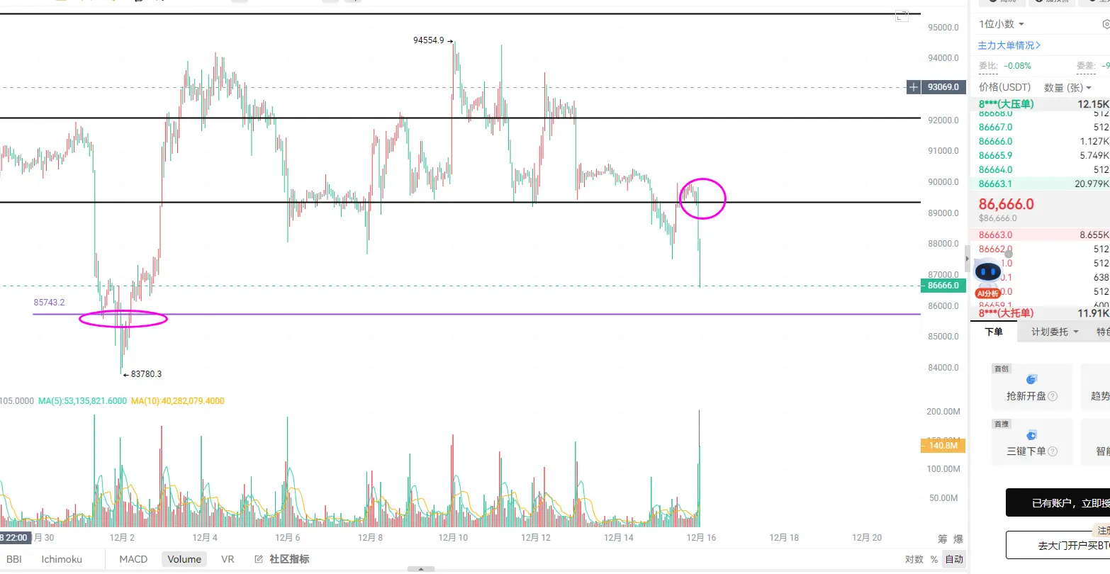 BTC: Pada awal hari, Bitcoin mengalami kenaikan cepat setelah dorongan besar, namun malam hari investor besar AS kembali menekan pasar, mempermainkan harga di level 90000-89000. Berdasarkan kondisi pasar saat ini, meskipun tren naik mungkin akan terjadi lagi di masa depan, kita sebaiknya segera mengamankan keuntungan dan menunggu dana luar pasar masuk kembali di hari Kamis dan Jumat untuk masuk lagi. Logika sederhananya adalah, selama garis tengah Bollinger berada di bawah level 4 jam, rebound akan kembali terjadi dengan volume yang kecil. Kemungkinan besar ini akan memberi bahan bakar bagi penjual. Dari tren saat ini, besar kemungkinan Bitcoin akan kembali menguji posisi masuk awal posisi Long di awal Desember di sekitar 86500, dan melakukan perbaikan lagi di area dasar. Dalam hal operasi, jika di siang hari posisi short sudah cukup aman, jangan terus mengejar posisi short di tengah jalan, dan posisi long harus menunggu dengan sabar di kisaran 86500-85800 untuk masuk posisi long lagi (asal volume rebound di kisaran ini menunjukkan peningkatan).