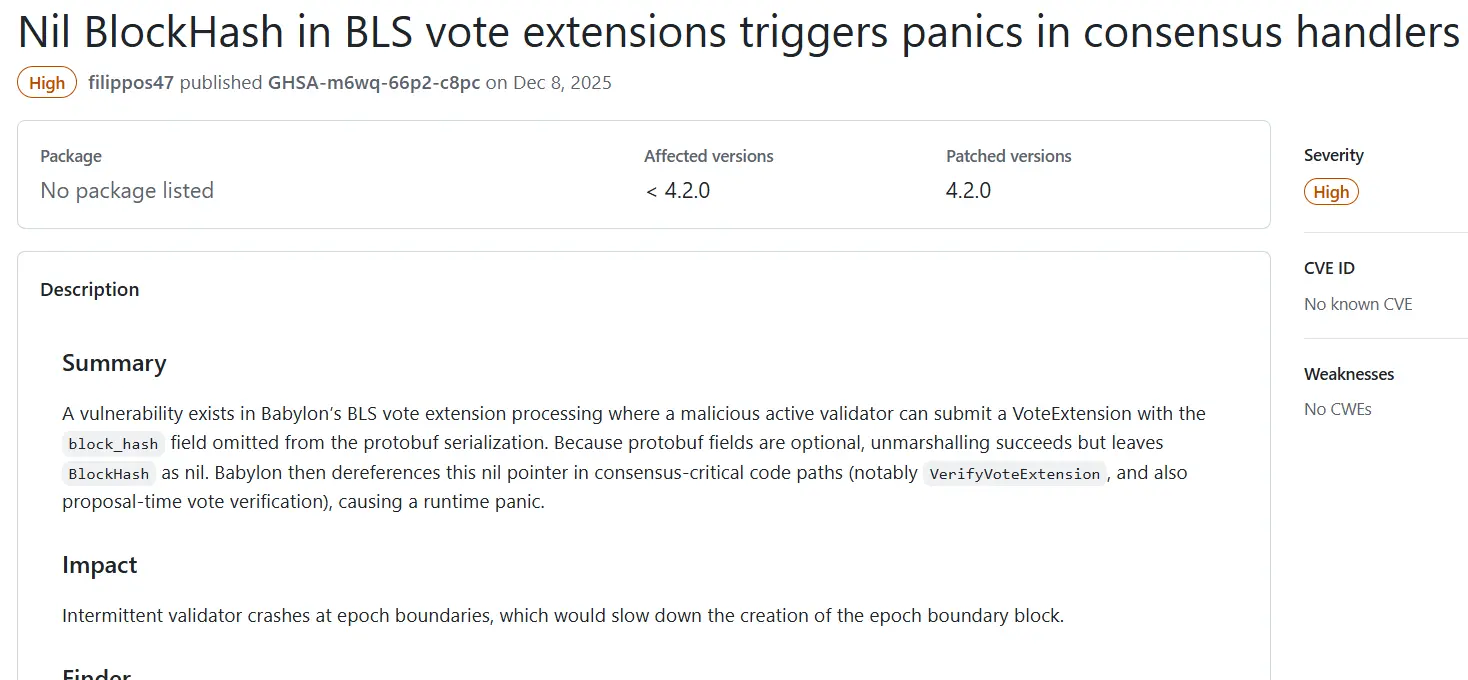 Sumber: CryptoNewsNet Judul Asli: Kerentanan ditemukan dalam kode staking Babylon yang dapat memperlambat produksi blok Tautan Asli: Sebuah cacat perangkat lunak yang baru diungkap dalam protokol staking Bitcoin Babylon mungkin memungkinkan validator jahat untuk mengganggu bagian dari proses konsensus jaringan, berpotensi memperlambat produksi blok selama periode kunci, menurut pengembang.