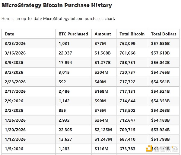 Strategy 3月共买入4次BTC,最近一次买入时间为3月23日。