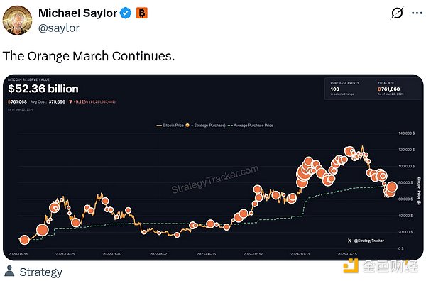 其次,对于Strategy而言,BTC已经成为了信仰。Michael Saylor将比特币定位为“Digital Capital(数字资本)”,称其为21世纪的终极储备资产。3月22日,Saylor表示:“橙色进军仍在继续。”尽管上周末市场暴跌导致该公司比特币投资亏损10%,但公司仍增持了比特币。