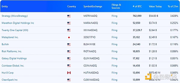 目前持有 BTC 762099枚,持有量稳居第一位,占2100万总量的3.629%。