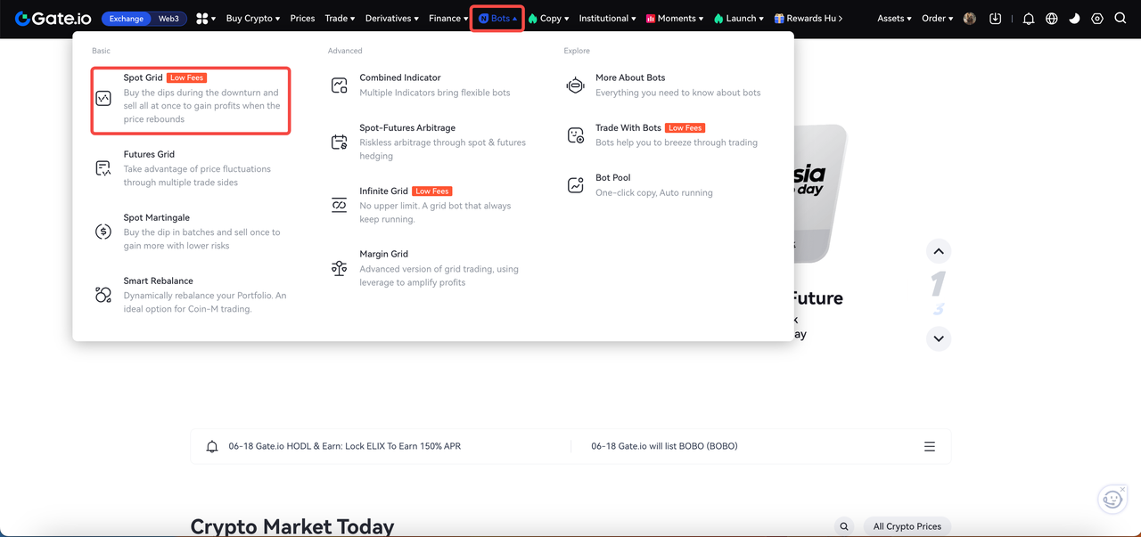 Gateのホームページにアクセス -「ボット」をクリック -「現物グリッド」を選択 -「ボット」をクリック -「カスタマイズ」を選択 -「手動変更」をクリック -「最低価格」およびその他のパラメータを入力。