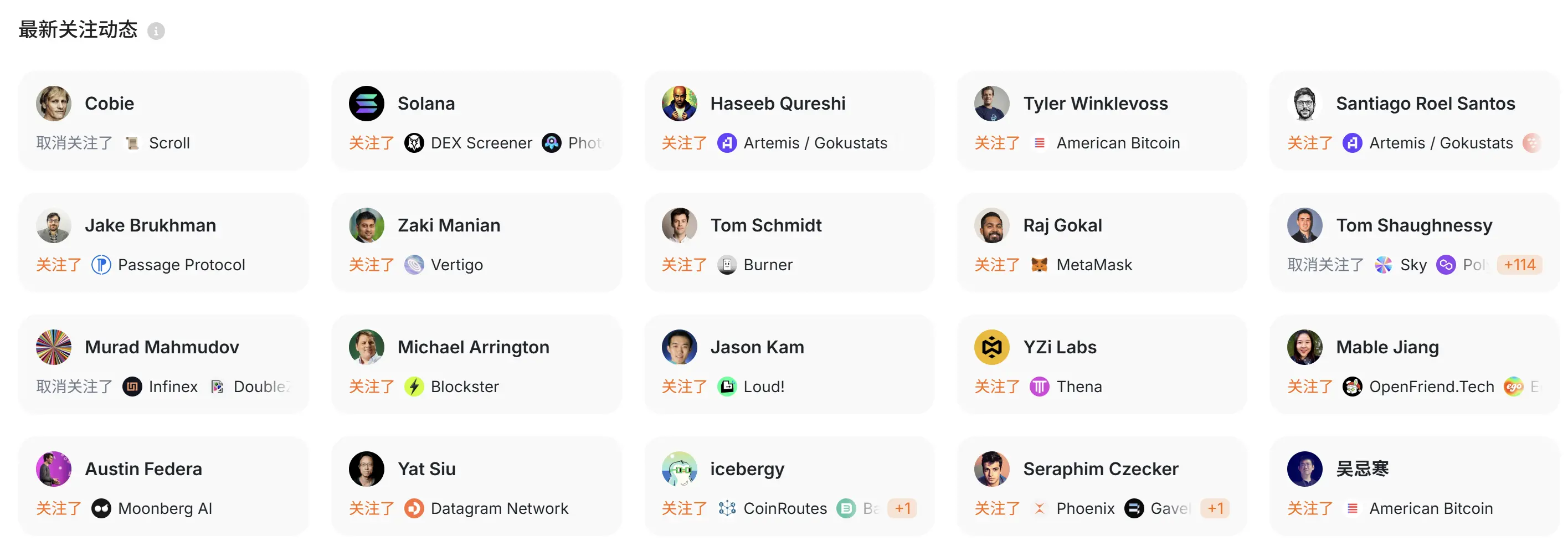 同時に、著名人の対外的なフォローとフォロワーの動向も確認できます。例えば、何一は最近Rita、川沐、彫刻などの人物をフォローし、冰蛙をフォロー解除しました。赵長鹏は最近、子時、Travala.comなどのアカウントをフォロー解除しました。