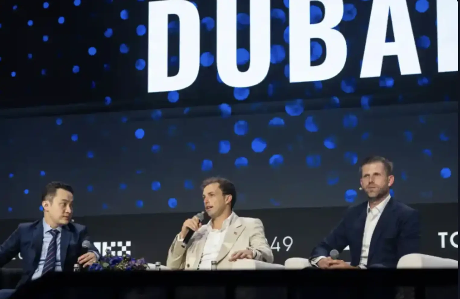ジャスティン・サン(左)、ザック・ウィトコフ(中)、トランプの次男エリック・トランプ(右)がドバイで開催された暗号通貨会議Token2049に出席