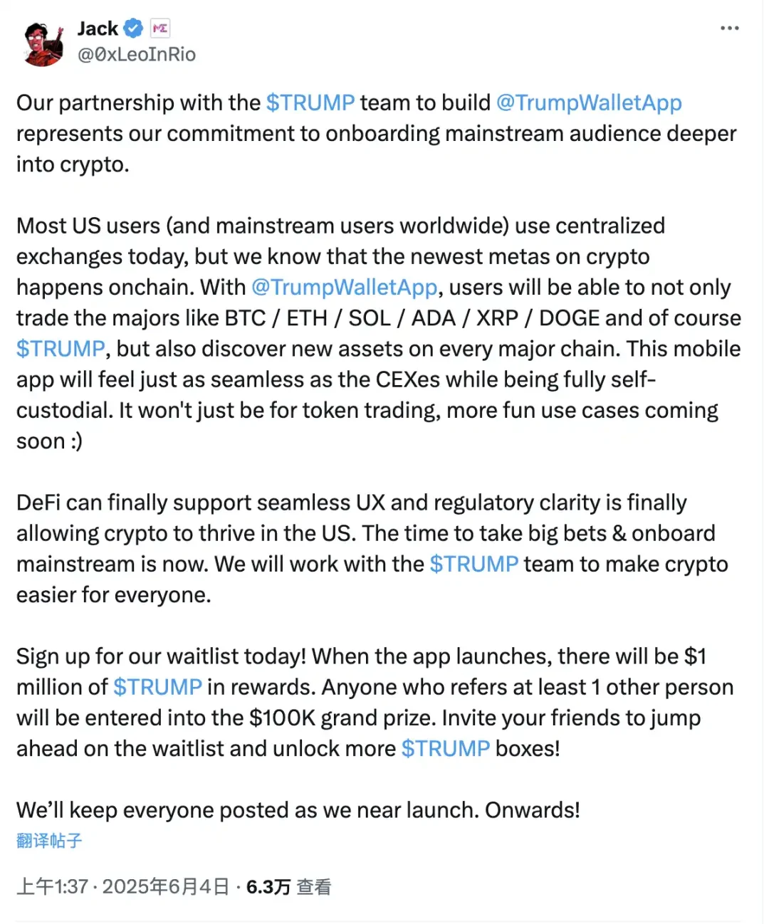 1時間後の1時35分、MagicEdenは@TrumpWalletAppのウォレットを構築するための$TRUMPとのパートナーシップを正式に発表しました。 彼らがメインアカウントで発表を行った後、多くのチームメンバーがそれをリツイートし、MagicEdenの共同創設者兼CEOのジャックはXをツイートして、「今日、順番待ちリストにサインアップしてください!」と付け加えました。 アプリが公開されると、100万ドルの$TRUMP報奨金が支払われます。 1人以上紹介して参加してもらうと、大賞$100,000が当たるチャンスがあり、「招待キャンペーン」の開始により、TrumpWalletAppの招待コードはコミュニティ内で瞬く間に広まりました。